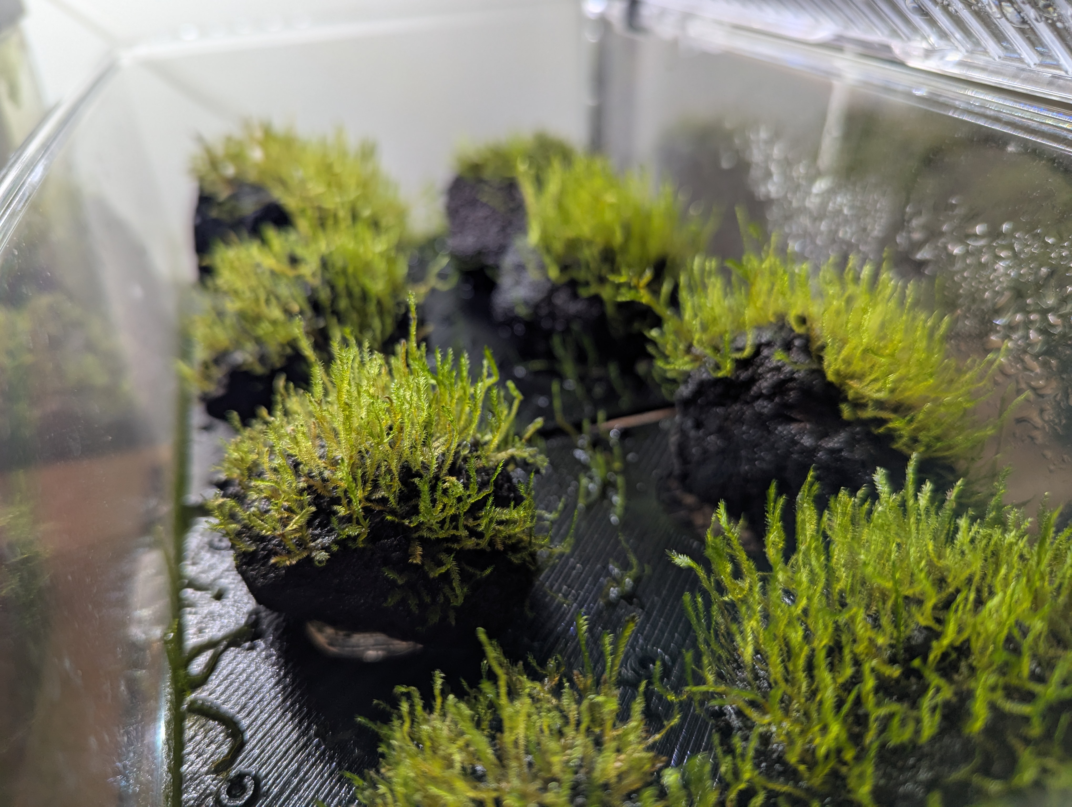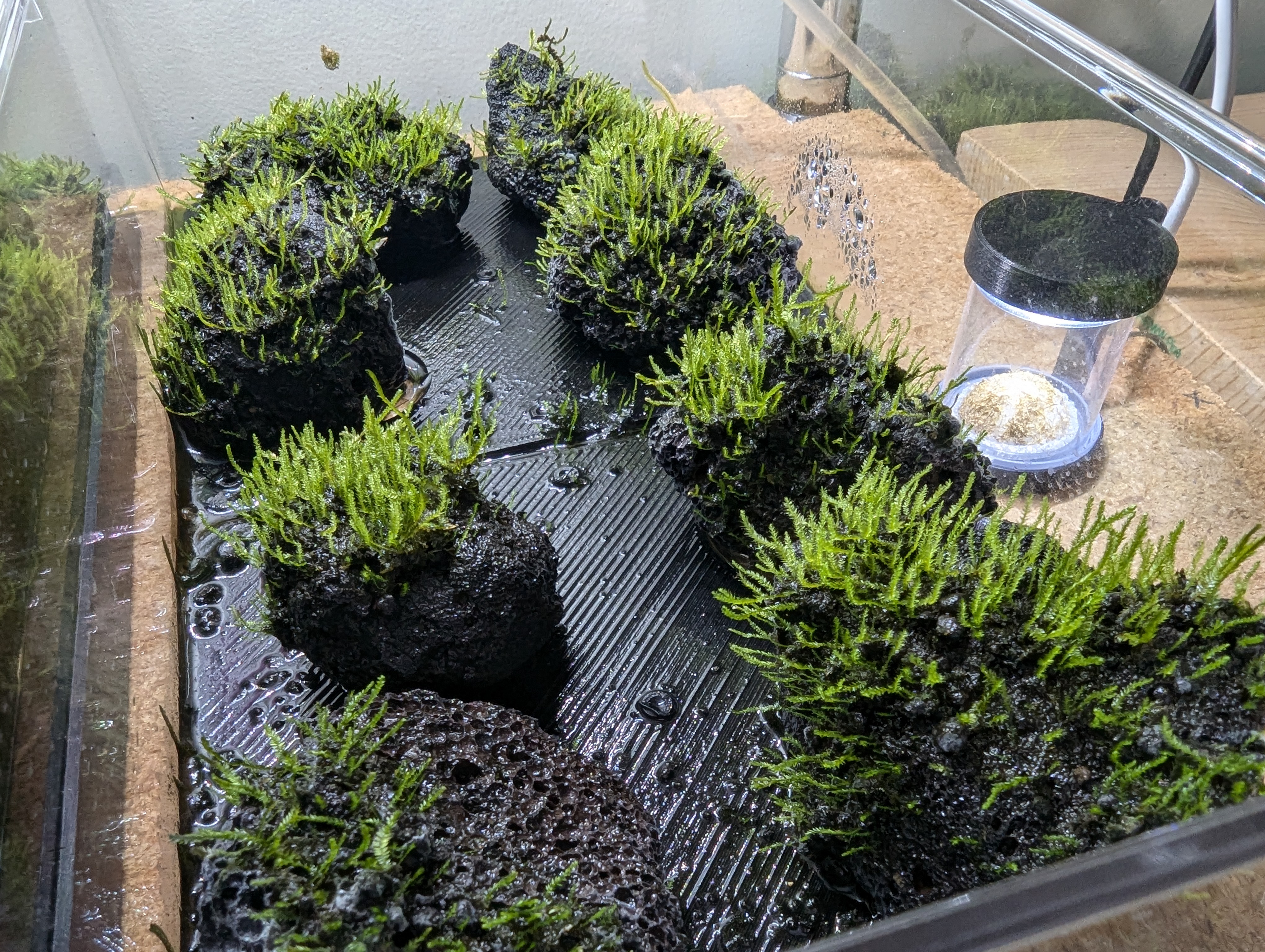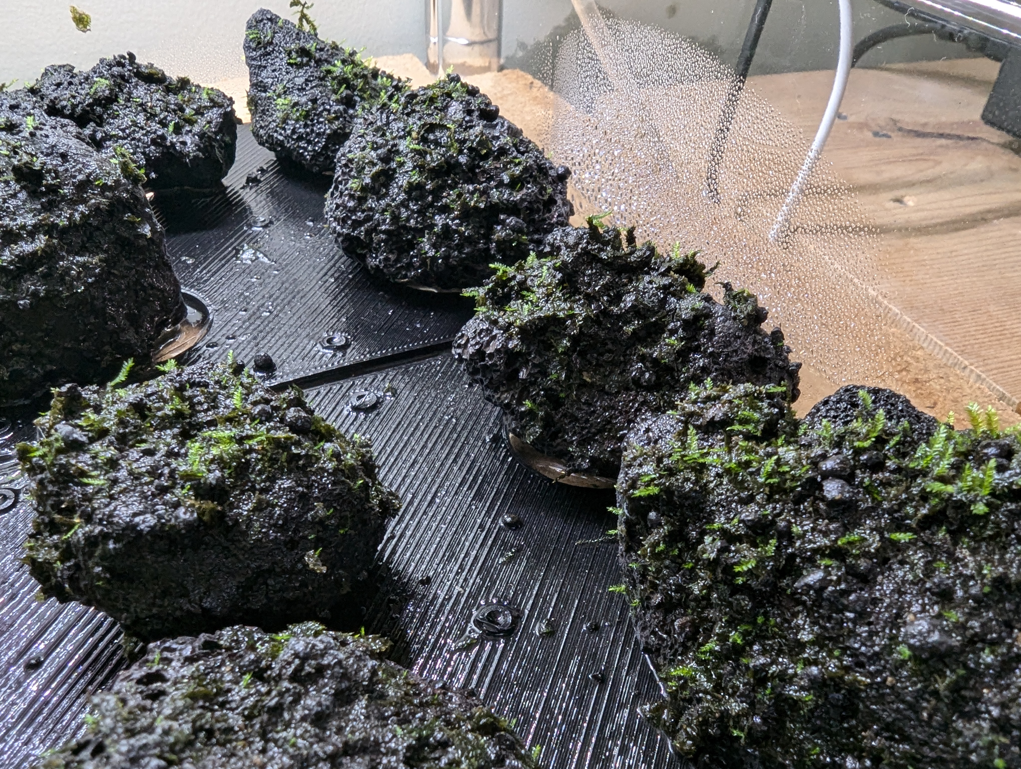 Many aquatic plants benefit from emersed propagation vs submerged. Plants have direct and unlimited access to CO2 and more direct access to light providing ideal conditions stronger growth. To create a more efficient and organized system for propagating decorative moss stones, a platform to hold differently sized and shaped stones to be held in place while controlling the level amount of emersion, moisture, and humidity was needed.